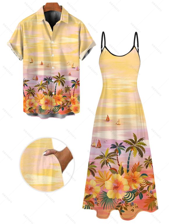 Vacation Couple Outfit Oil Painting Coconut Tree Floral Print Long Dress and Shirt Set - PALE GOOSE YELLOW S | US 4