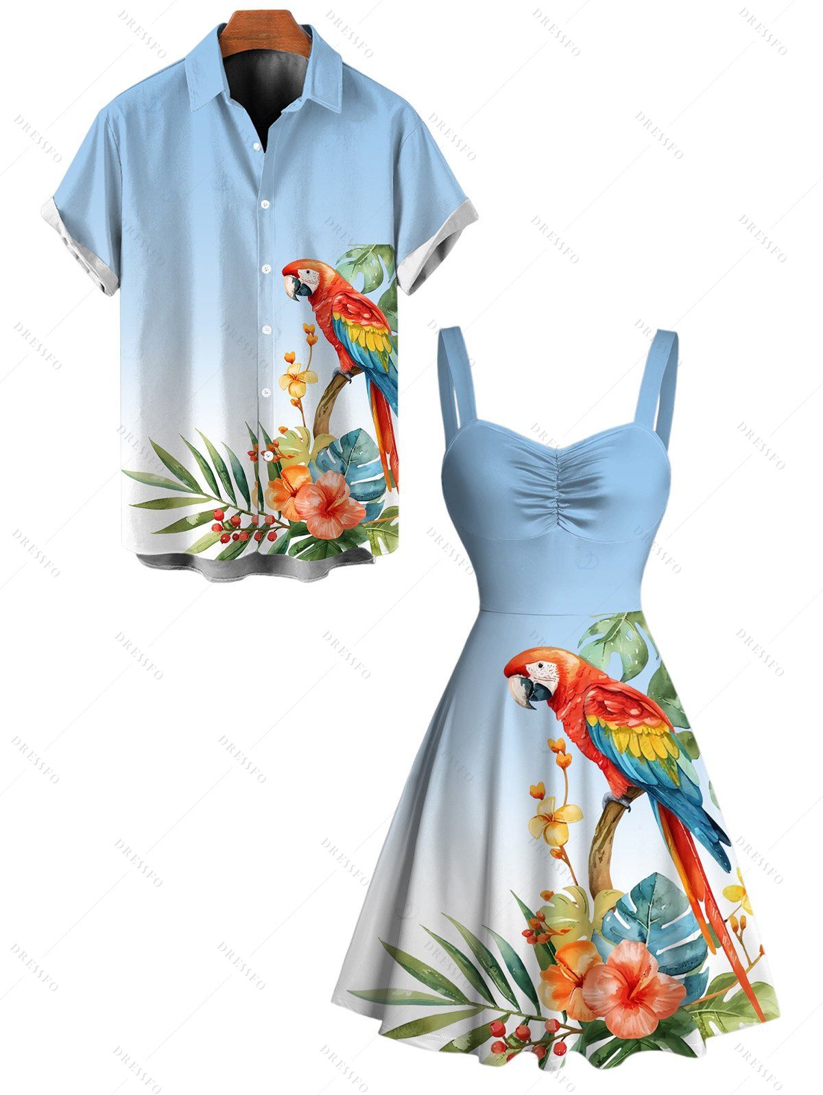 Vacation Couple Outfit Ombre Parrot Tropical Leaf Hibiscus Floral Print Ruched Bust Dress and Shirt Set - Bleu Poudre S | US 4