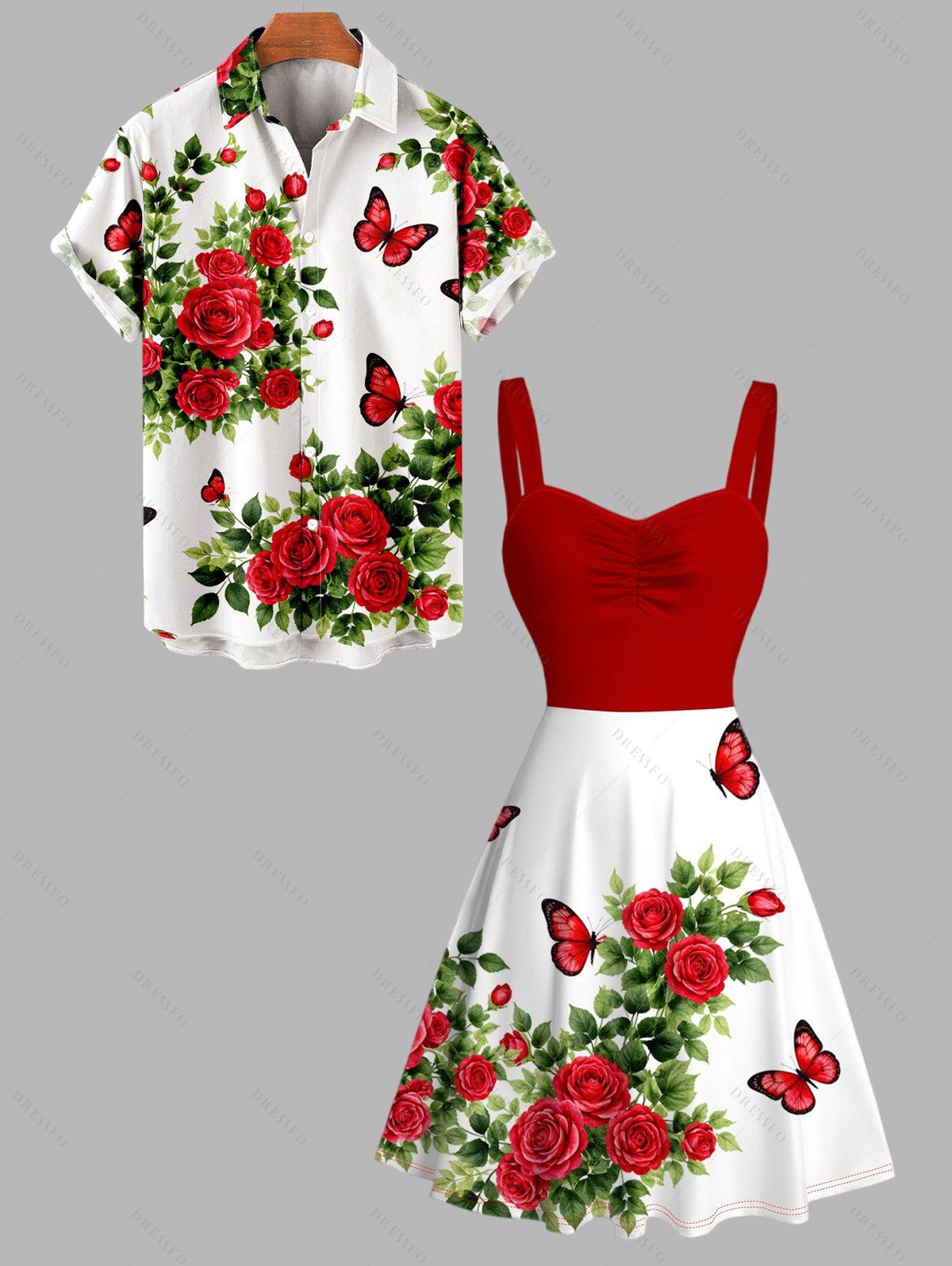 Vacation Couple Outfit Romantic Rose Butterfly Print Ruched Dress and Shirt Set - Rouge S | US 4