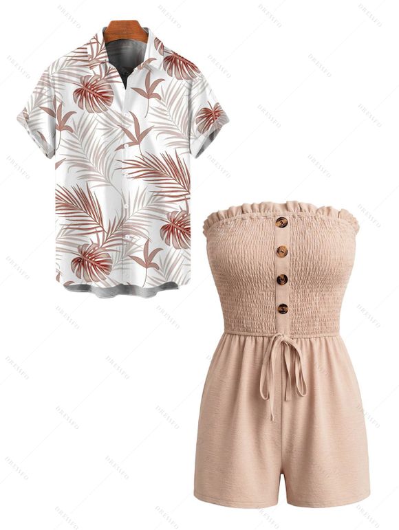 Vacation Couple Outfit Solid Color Ruffle Cinched Romper and Tropical Leaf Print Shirt Set - café lumière S | US 4