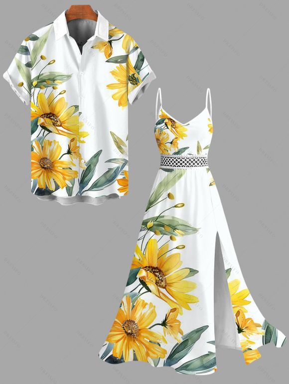 Vacation Couple Outfit Sunflower Leaf Print Hollow Out Slit Dress and Shirt Set - Jaune S | US 4