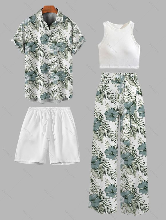 Vacation Couple Outfit Textured Tank Top Hibiscus Floral Print Belt Pants and Shirt Short Set - Vert clair S | US 4