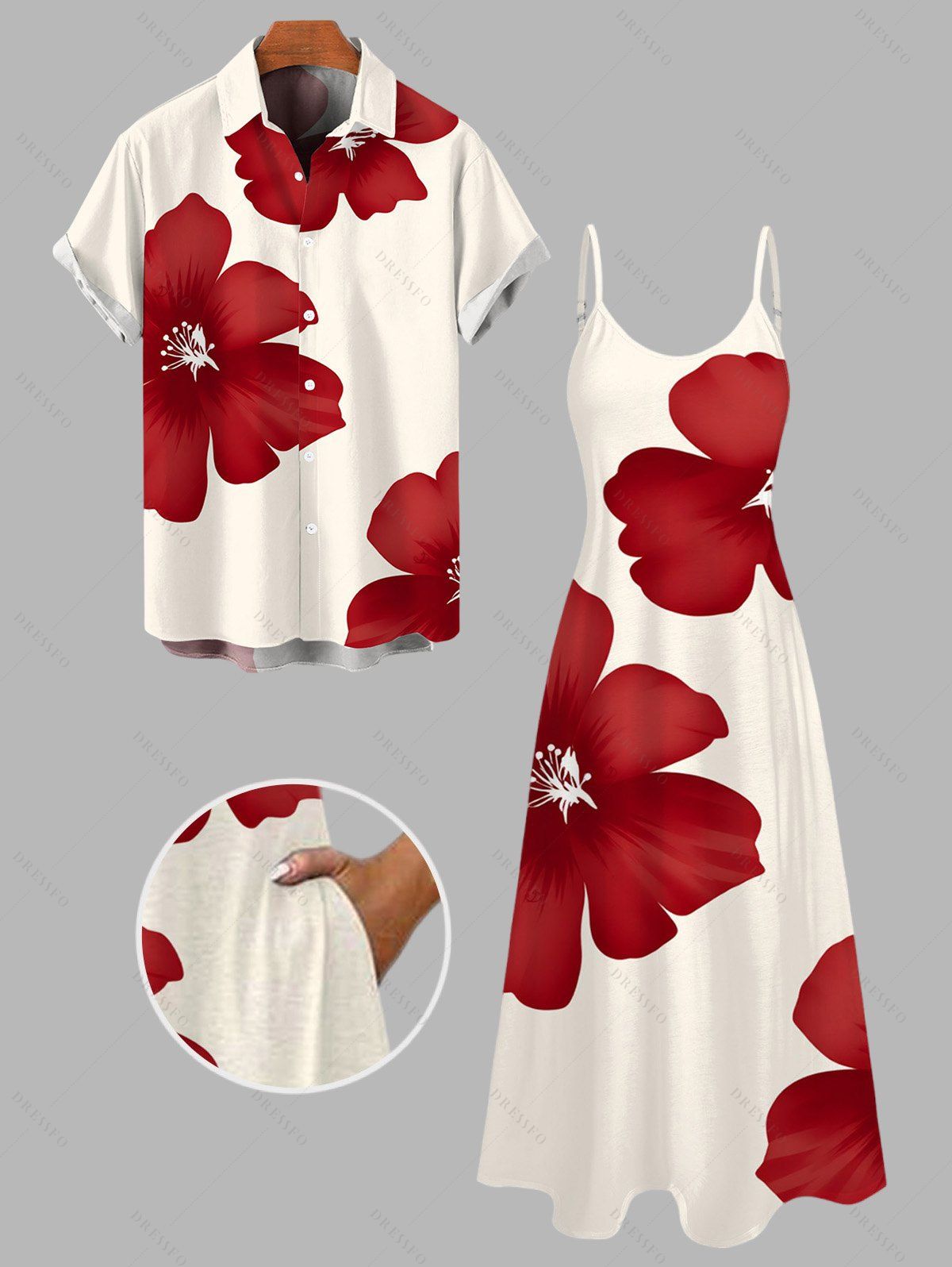 Vacation Couple Outfit Tropical Hibiscus Floral Print Pocket Dress and Shirt Set - Rouge Vineux S | US 4