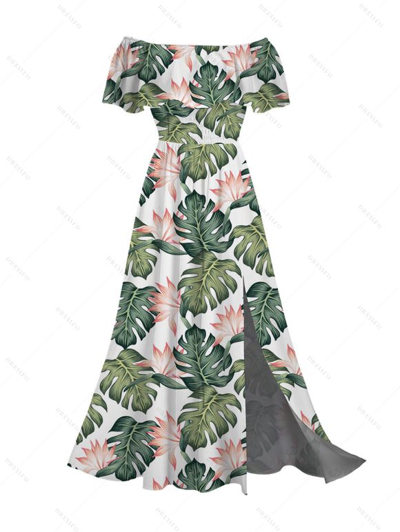 Vacation Dress Tropical Monstera Botanical Print Flounce Off the Shoulder Slit Dress - Vert XXXXXL | US 20
