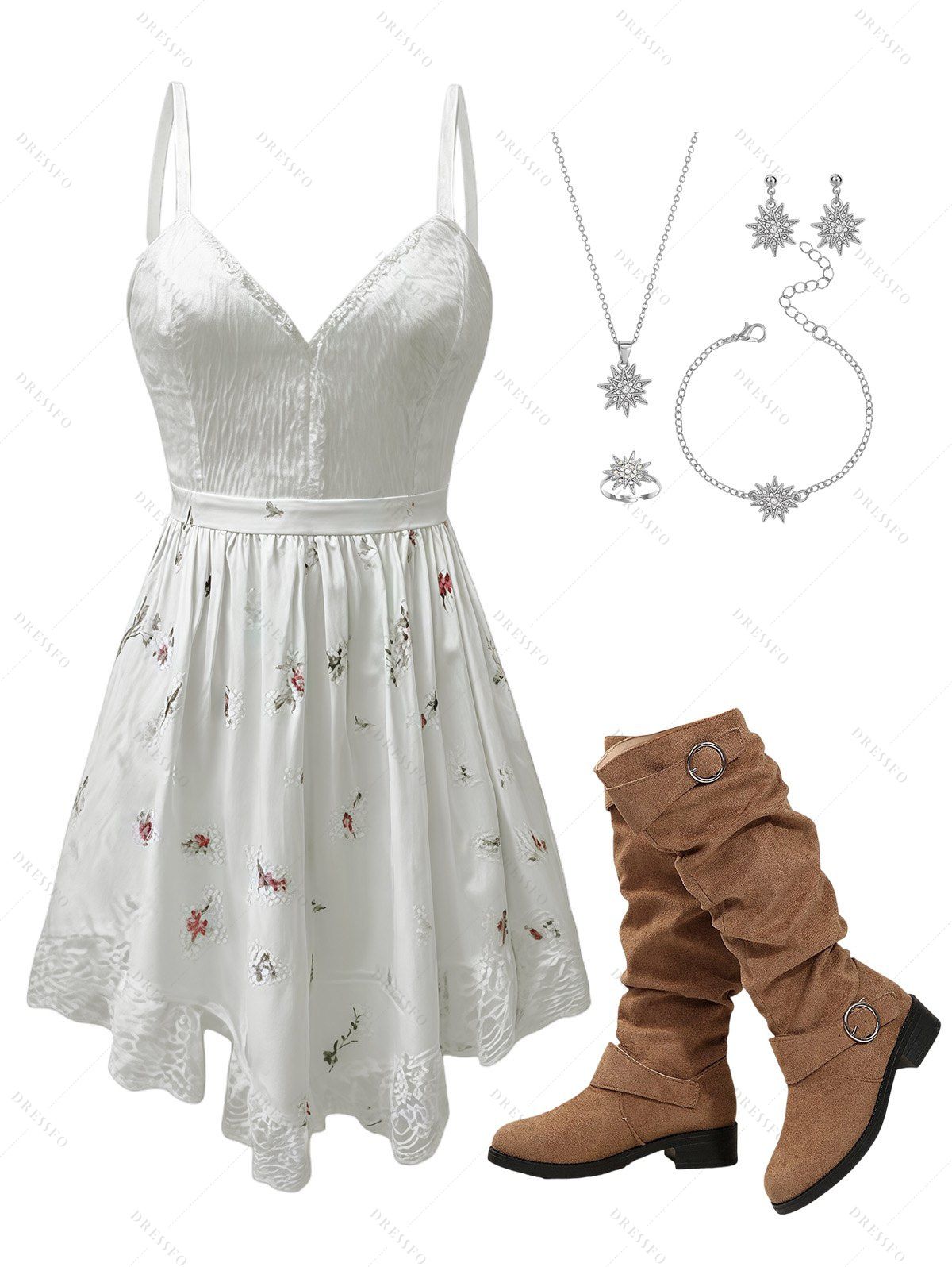 Vacation Outfit Ditsy Floral Print Irregular Dress and Snowflake Accessories Boots Set - Blanc S | US 4