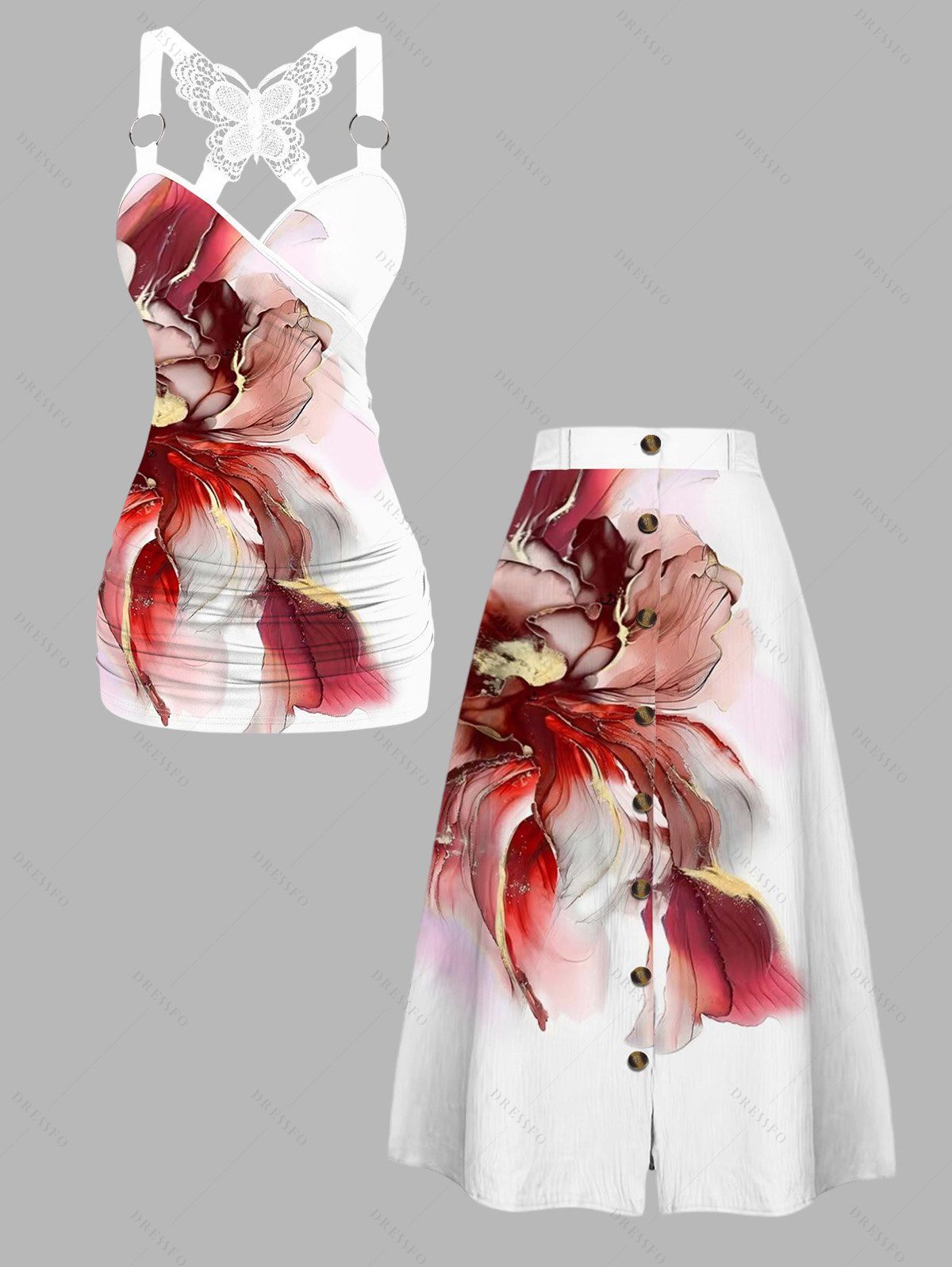 Vacation Outfit Flower Pattern Lace Butterfly Ruched Tank Top and Skirt Set - Rouge Vineux S | US 4