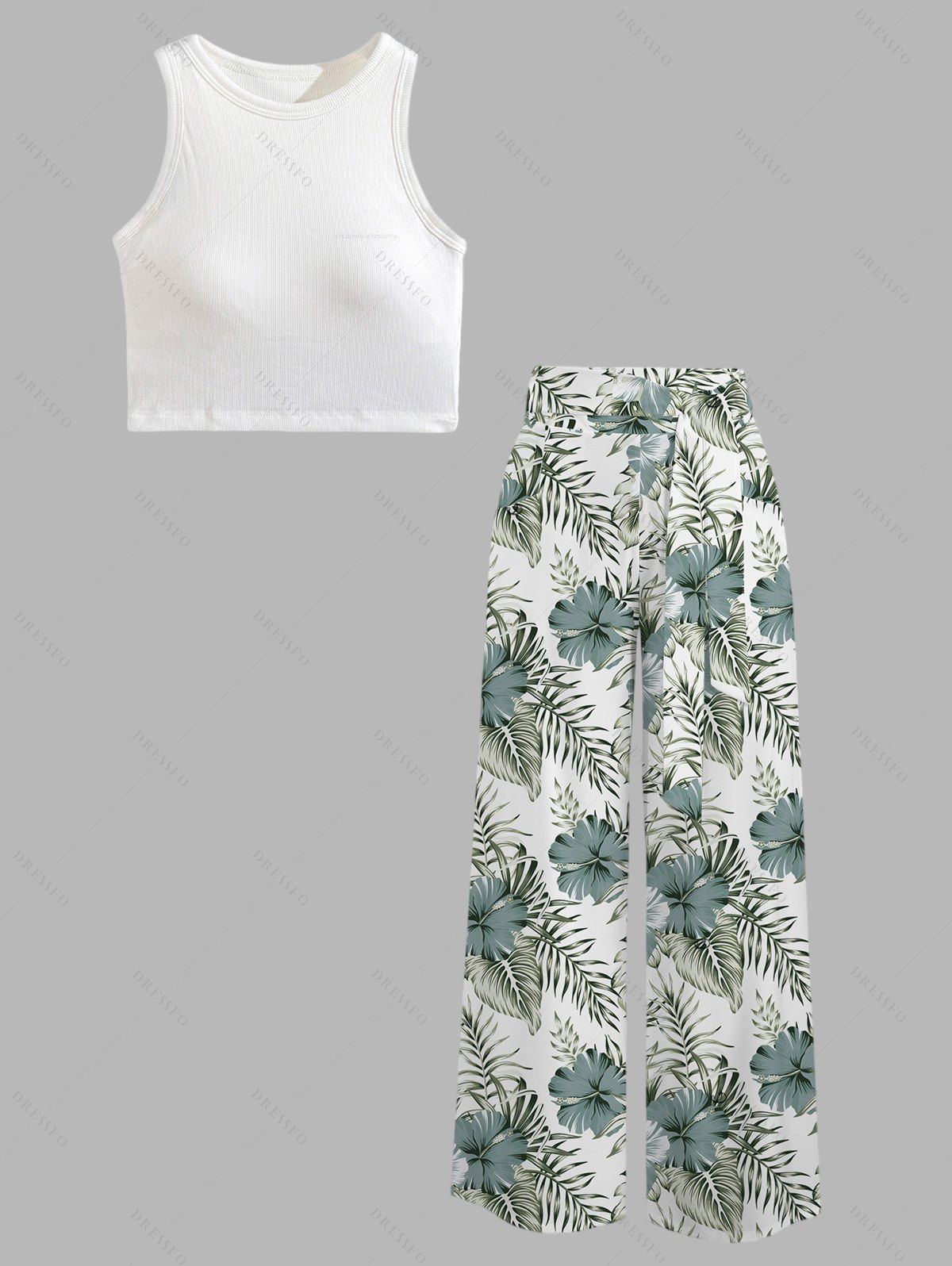 Vacation Outfit Textured Padded Cropped Tank Top and Hibiscus Floral Leaf Print Belt Pants Set - Vert clair S | US 4