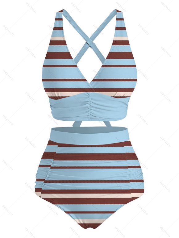 Vacation Swimsuit Colorful Striped Print Crossover Tummy Control Ruched Briefs Swimwear Set - Bleu Toile de Jean XXL | US 14