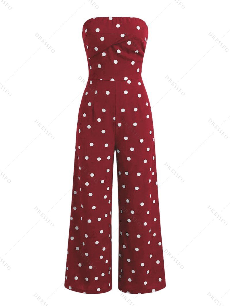 Vintage Vacation Jumpsuit Polka Dots Print Ruched Off the Shoulder Wide Leg Jumpsuit - Rouge Vineux XL | US 12