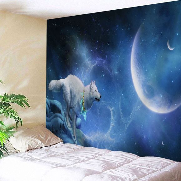 Tapisserie Murale Pendante Décoration d'Art Loup et Lumière de Lune - bleu nuit W51 INCH * L59 INCH