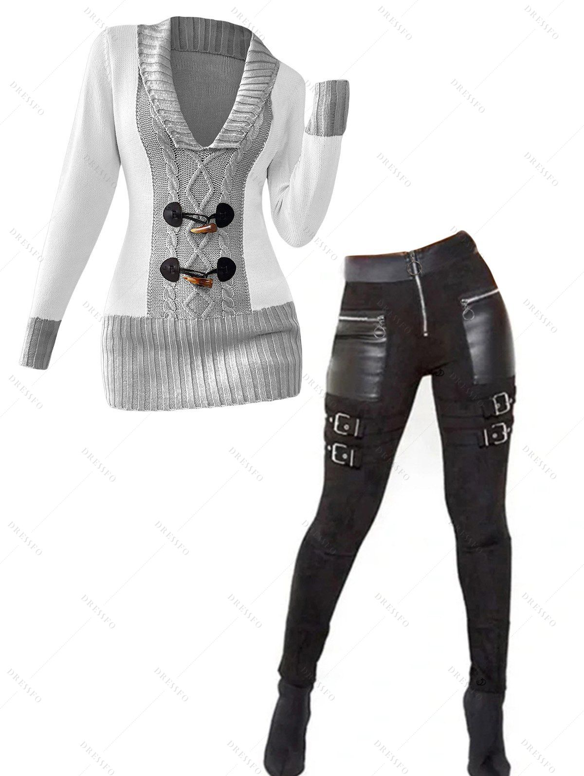 Winter Outfit Mock Horn Button Sweater and Buckle Leggings Set - Gris Clair S | US 4