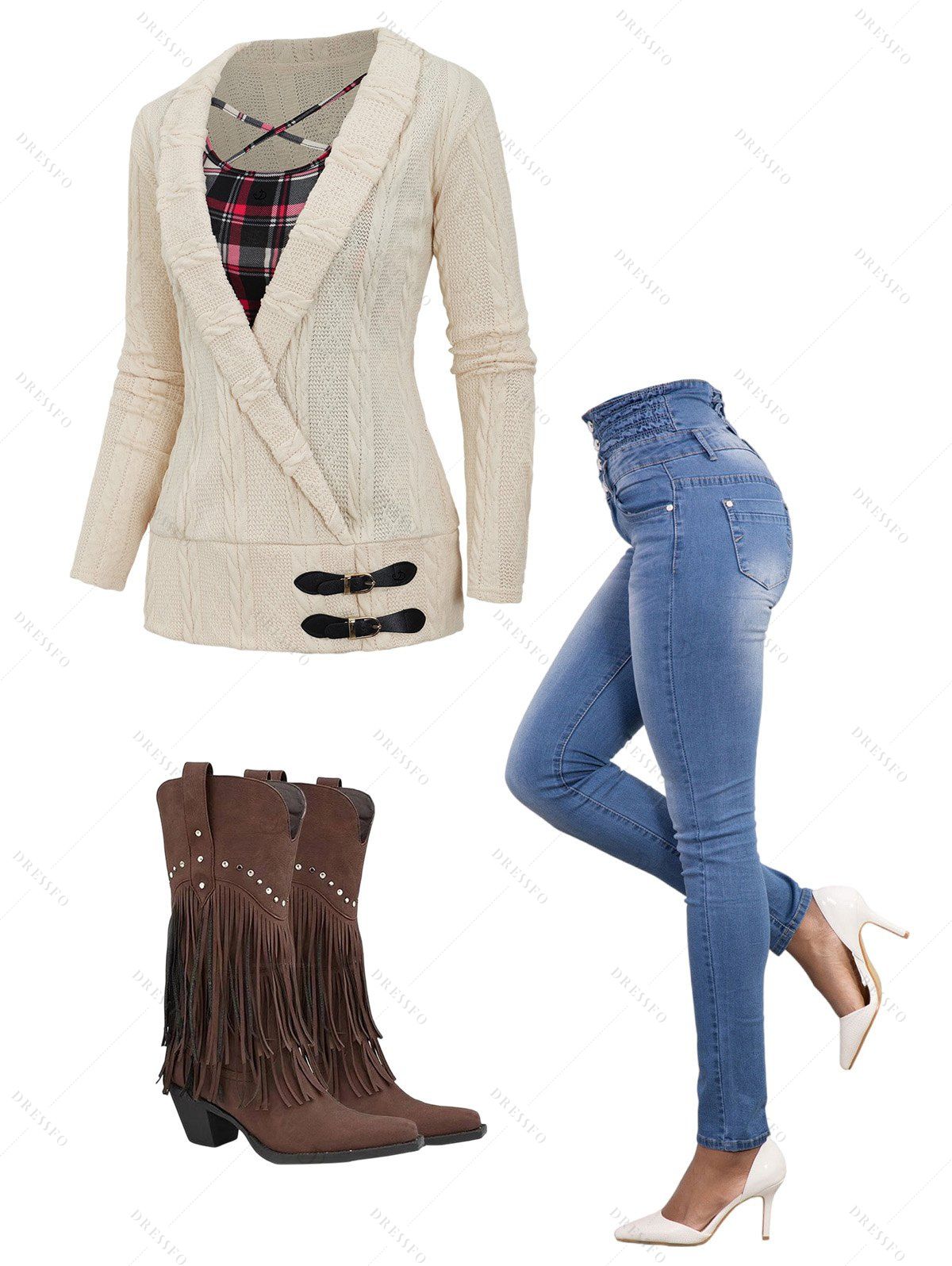 Women Outfit Colorblock Plaid Print Cable Knit Top Jeans and Boots Set - Abricot S | US 4