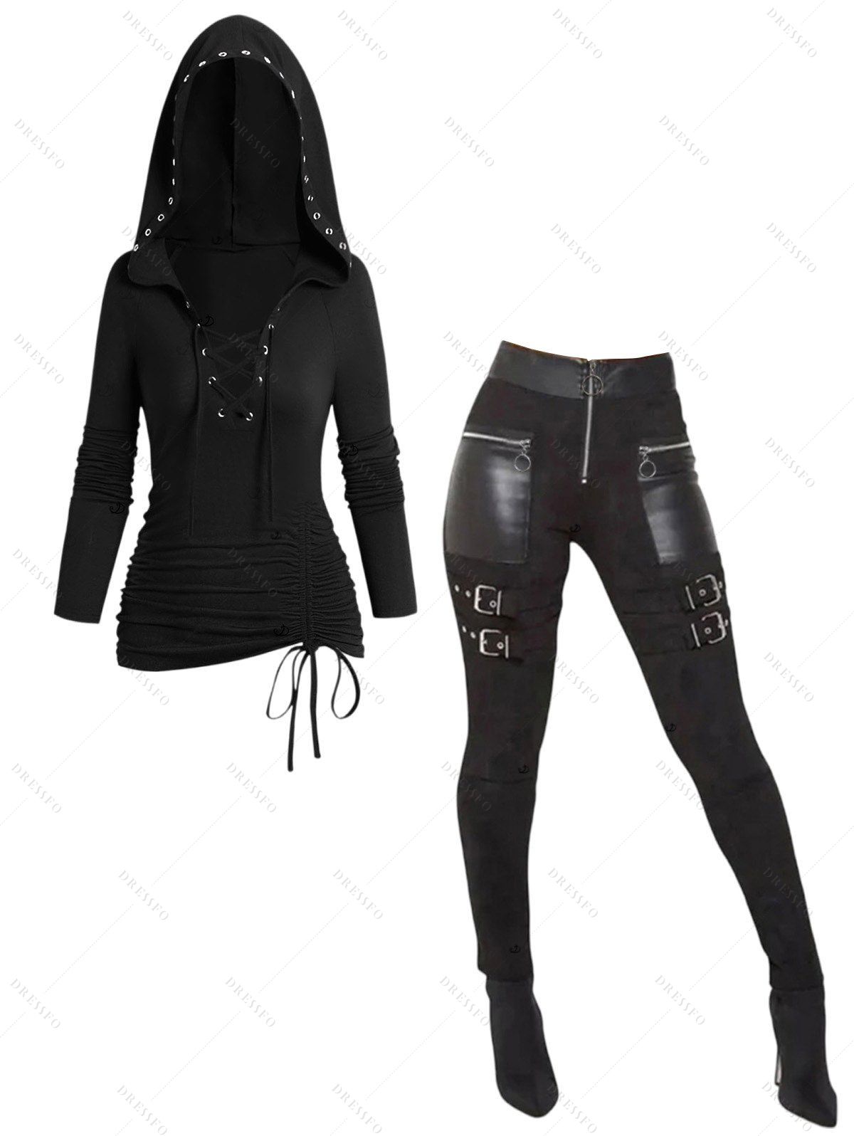 Women Outfit Lace Up Hoodie Top and Zipper Buckle Leggings Set - Noir S | US 4