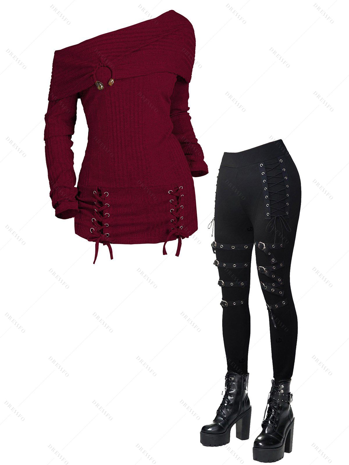 Women Winter Outfit Solid Color Lace Up Long Sweater and Buckle Leggings Set - Rouge Vineux S | US 4